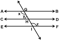 In the figure given below, if AB || CD, CD || EF and y: z = 4: 5, then find the value of ∠x: ![]() |