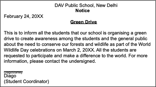 Observe the format of a notice. Choose the correct option for the following question: What should be written in D? ![]() |