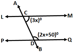 In the given figure, LM and PQ are parallel to each other and AB is the transversal. If ∠MCD = (3x)° and ∠QDC = (2x + 50)°, then find the value of x: ![]() |