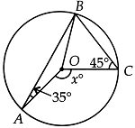 In the given figure, O is the centre of the circle. If ∠BAO = 35° and ∠ BCO = 45° then the value of x will be: ![]() |