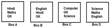 The following figure four boxes with different books in them. Which of the following book is kept in more than two boxes?
