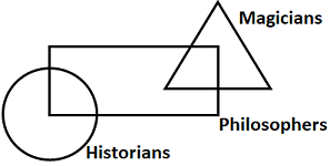 Read the following information and then answer the question that follows. In the figure, the rectangle stands for philosophers, circle for historians and triangle for magicians: According to the diagram given below, which one of the following statements is not true? ![]() |