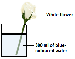 Lina set up the experiment shown below. She placed a white flower in a beaker with 300 ml of blue colored water at the start of the experiment. What will she observe after 8 hours? ![]() |
