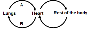 The diagram below shows the blood flow between the heart, the lungs and the rest of the body. Which one of the following best describe the blood at A and B? ![]() |