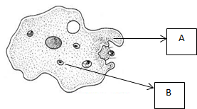 Maya drew the picture of the single-celled organism named amoeba below. Help her to identify parts named A and B and also the function of part A correctly: ![]() |