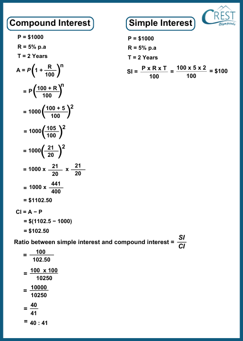 Example: What will be the ratio between simple interest and compound interest if the sum of $1000 is deposited in a bank at 5% per annum for 2 years?