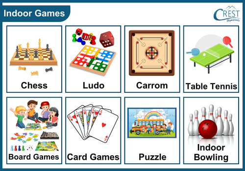 4. Examples: Chess, ludo, carrom, table tennis, board games (like monopoly, scrabble), card games (like uno), puzzles, indoor bowling, etc.