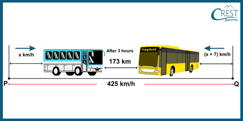 5. There is a distance of 425 kilometres between two points P and Q. Two buses start simultaneously from P and Q towards each other and the distance between them after 3 hours is 173 km. If the speed of one bus is 7 km/h more than the speed of other buses, what is the speed of each bus?